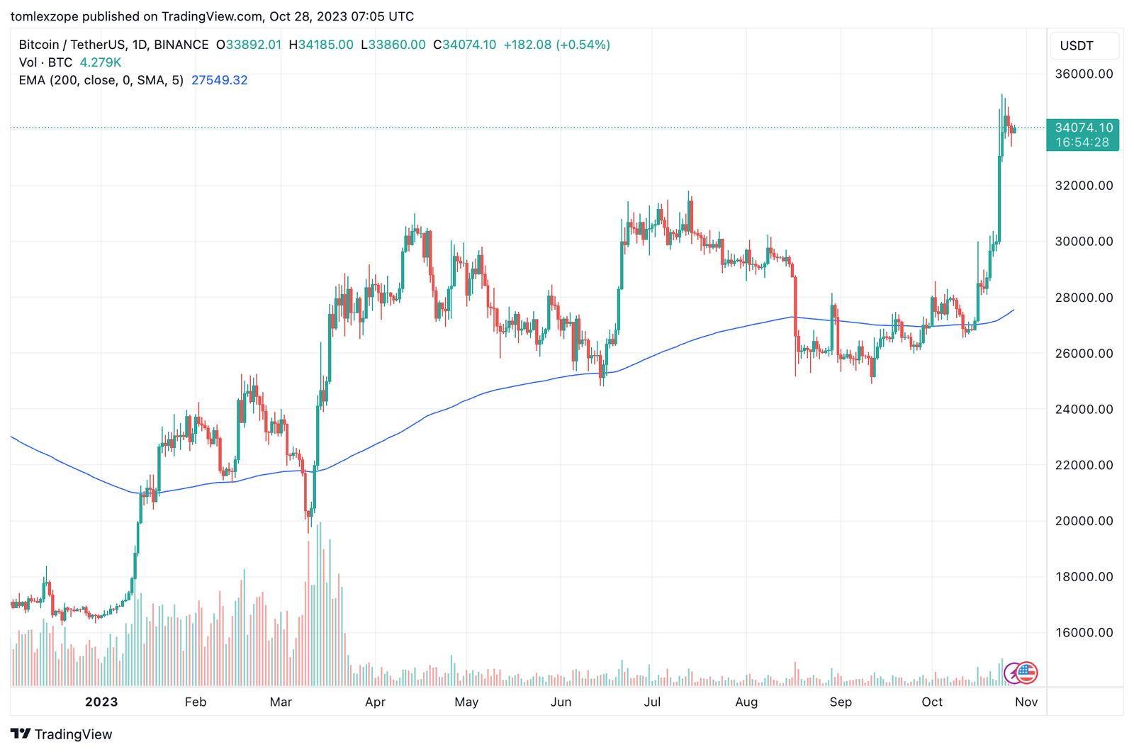 “Pada hari Rabu, 25 Oktober, Bitcoin menyentuh, meskipun gagal untuk ditutup di atas, level US$35.000 untuk pertama kalinya sejak pertengahan tahun 2022,” tulis media crypto dalam pers baru-baru ini.