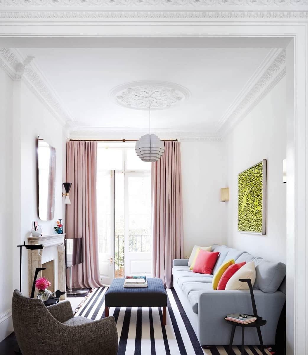 Agar ruang tamu jadi semakin ramai, gunakan aksesoris dengan beragam warna dan model. Pemakaian karpet berpola garis-garis hitam putih memberikan suasana ruangan jadi terekspos.