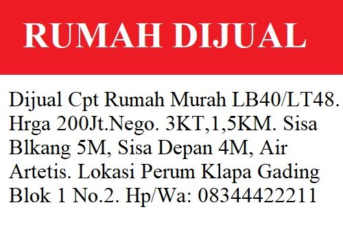 - Dijual Cpt Rumah Murah LB40/LT48.Hrga 200Jt.Nego. 3KT,1,5KM. Sisa Blkang 5M, Sisa Depan 4M, Air Artetis. Lokasi Perum Klapa Gading Blok 1 No.2. Hp/Wa: 083444222***