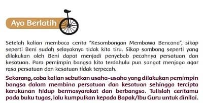 Setelah kalian membaca cerita “Kesombongan Membawa Bencana”, sikap seperti Beni sudah selayaknya tidak kita tiru. Sikap sombong seperti yang dilakukan oleh Beni dapat menjadi penyebab pecahnya persatuan dan kesatuan. Para pemimpin bangsa kita terdahulu pun sangat menjaga agar rasa persatuan dan kesatuan tidak terpecah.
