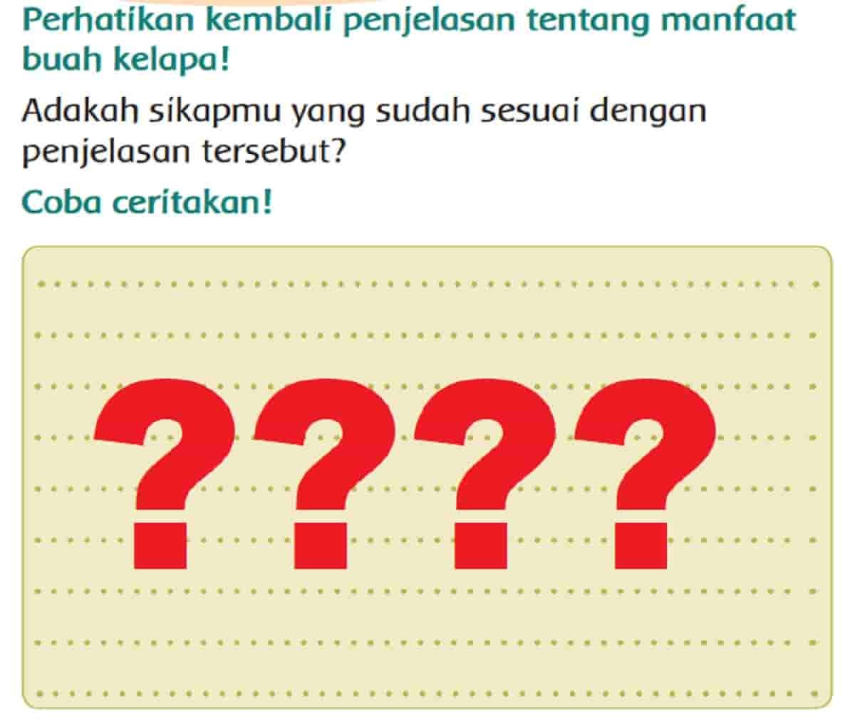 Adakah sikapmu yang sudah sesuai dengan penjelasan tersebut, coba ceritakan! Perhatikan kembali penjelasan tentang manfaat buah kelapa! Pembahasan kunci jawaban tema 8 kelas 3 halaman 90, tepatnya pada materi pembelajaran 4 subtema 2 Aku Anak Mandiri buku tematik siswa kurikulum 2013 revisi 2018.