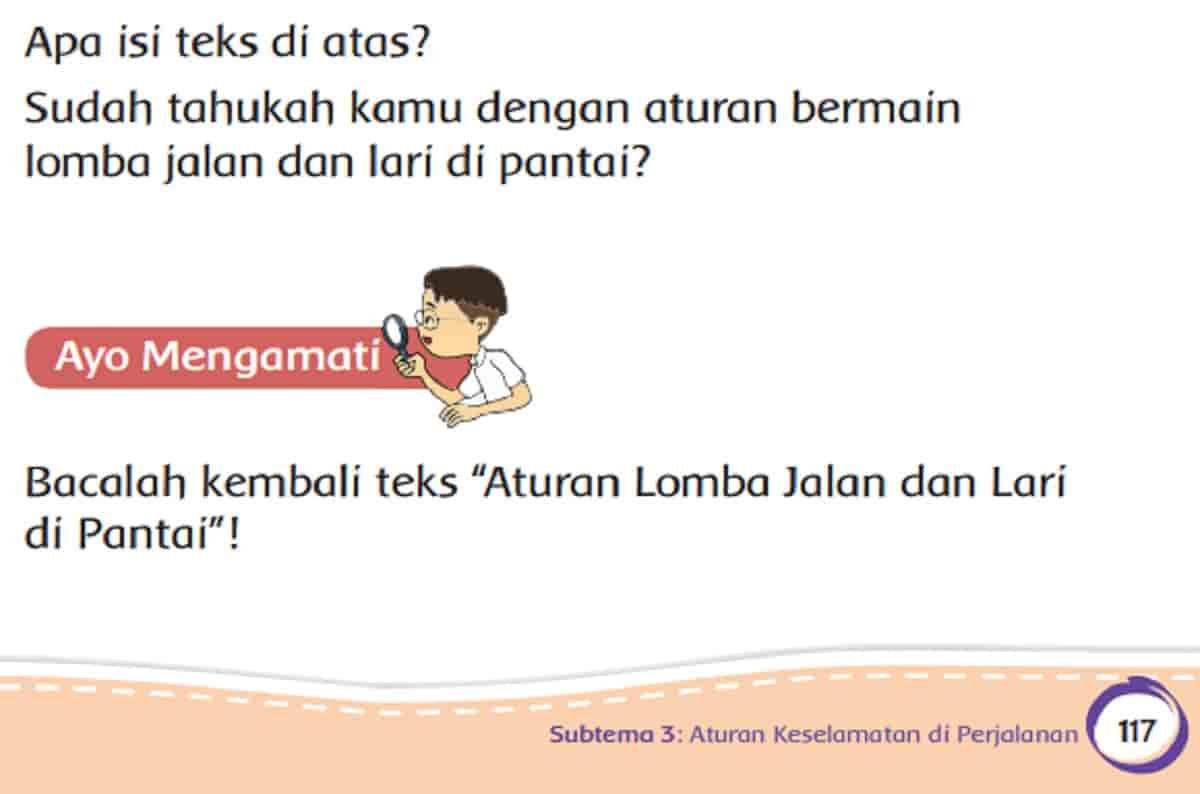 Apa isi teks di atas? Sudah tahukah kamu dengan aturan bermain lomba jalan dan lari di pantai? Pembahasan kunci jawaban tema 8 kelas 2 halaman 117, tepatnya pada materi pembelajaran 2 subtema 3 Aturan Keselamatan di Perjalanan, buku tematik siswa kurikulum 2013.
