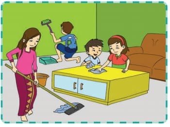 Apa saja kegiatan Dayu dan keluarga? Jawab : Kegiatan dayu dan keluarga sedang membersihkan rumah bersama.