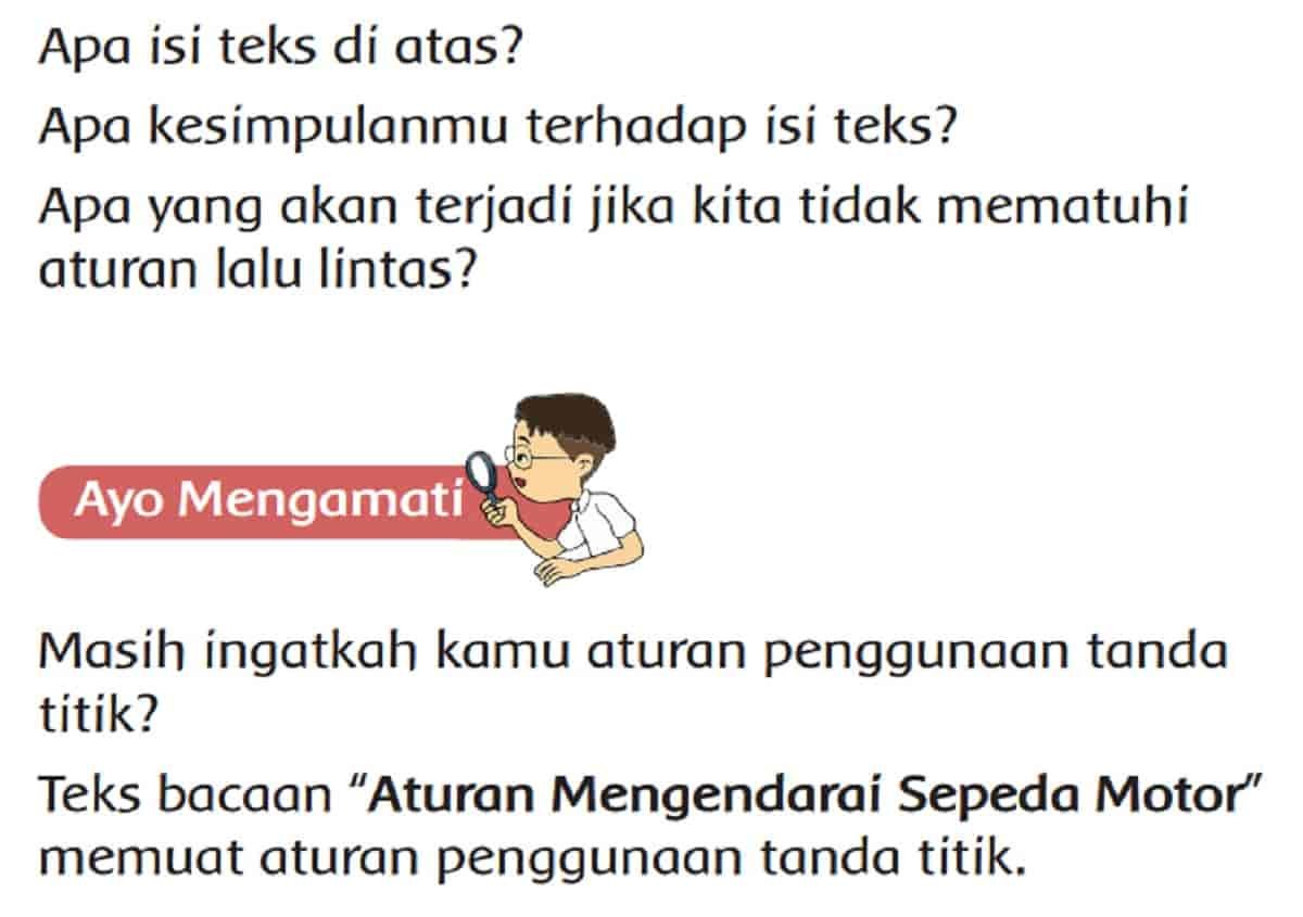 Apa yang akan terjadi jika kita tidak mematuhi aturan lalu lintas? Apa isi teks di atas? Apa kesimpulanmu terhadap isi teks Aturan Mengendarai Sepeda Motor? Pembahasan kunci jawaban tema 8 kelas 2 halaman 132, tepatnya pada materi pembelajaran 4 subtema 3 Aturan Keselamatan di Perjalanan, buku tematik siswa kurikulum 2013.