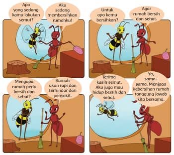 Apa isi percakapan lebah dan semut di atas? Jawaban : Isi percakapan bacaan diatas yaitu tentang membersihkan rumah.