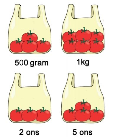 Buatlah berbagai perbandingan berat tomat dengan berbagai satuan ukuran berat. Jangan lupa menggunakan tanda >, <, atau =