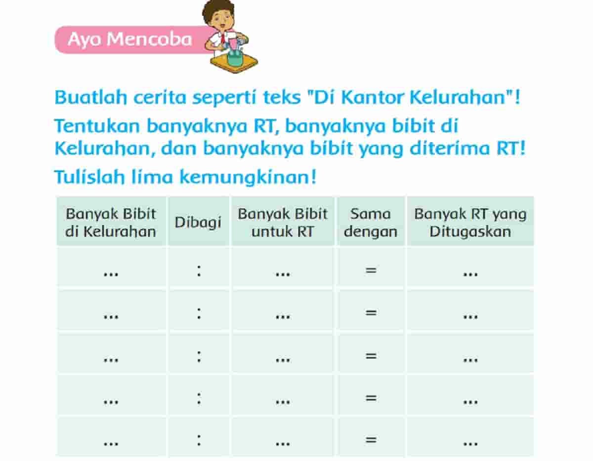 Buatlah cerita seperti teks Di Kantor Kelurahan! Tentukan banyaknya RT, banyaknya bibit di Kelurahan, dan banyaknya bibit yang diterima RT! Tulislah lima kemungkinan!