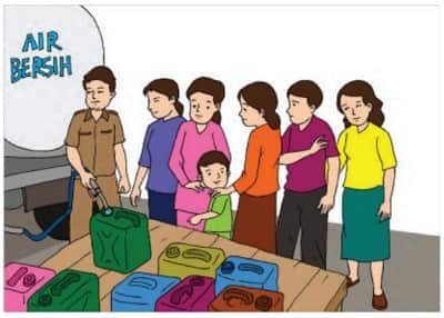 Warga masyarakat Desa Maju Jaya mengantri air bersih bantuan dari pemerintah. Pada musim kemarau desa mereka mengalami kekurangan air bersih. Sebaiknya warga melakukan gerakan menghemat air sehingga pada musim kemarau tidak kekurangan air bersih. Agar tidak terjadi antrian air warga sebaiknya menjaga lingkungan dengan cara menanam banyak pohon.