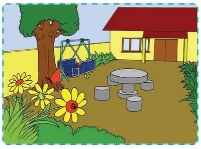 Halaman rumah pada gambar tersebut terlihat terawat, bersih, dan rapi. Terdapat tempat duduk dan meja dan juga ayunan yang bisa digunakan untuk bersantai. Ditambah dengan adanya pohon rindang, tidak terlalu panas jika berada di bawah pohon tersebut. Bunga yang cantik memperindah pemandangan tempat itu.