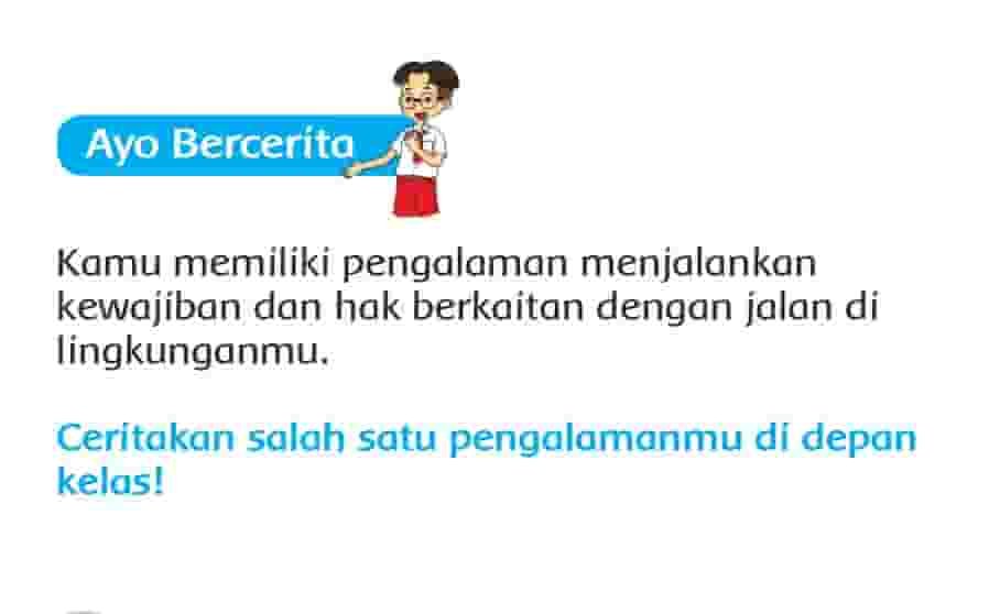Ceritakan salah satu pengalamanmu menjalankan kewajiban dan hak berkaitan dengan jalan di lingkunganmu! Pembahasan kunci jawaban tema 4 kelas 3 halaman 160. Tepatnya pada materi pembelajaran 4 subtema 4 Kewajiban dan Hakku Sebagai Warga Negara buku tematik siswa revisi 2018.