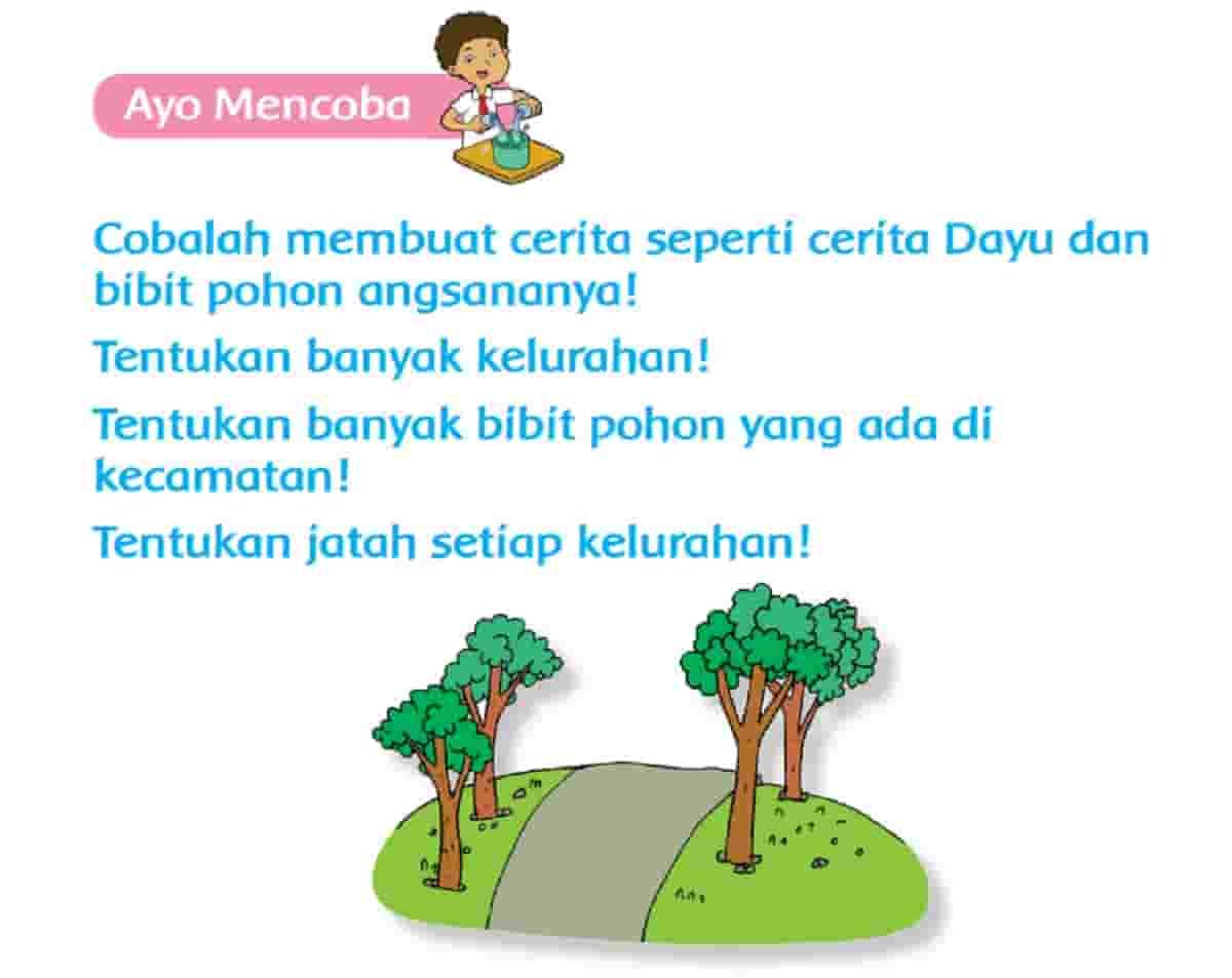 Cobalah membuat cerita seperti cerita Dayu dan bibit pohon angsananya! Tentukan banyak kelurahan! Tentukan banyak bibit pohon yang ada di kecamatan! Tentukan jatah setiap kelurahan! Pembahasan kunci jawaban tema 4 kelas 3 halaman 146. Tepatnya pada materi “Teks Demam Berdarah” pembelajaran 1 subtema 4 Kewajiban dan Hakku Sebagai Warga Negara buku tematik siswa revisi 2018.