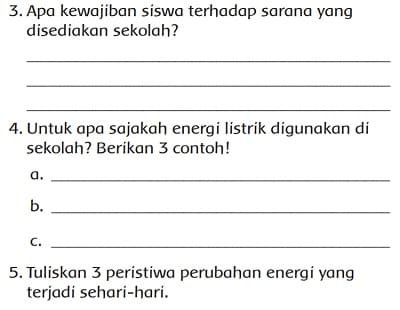 4. Untuk apa sajakah energi listrik digunakan di sekolah? Berikan 3 contoh!