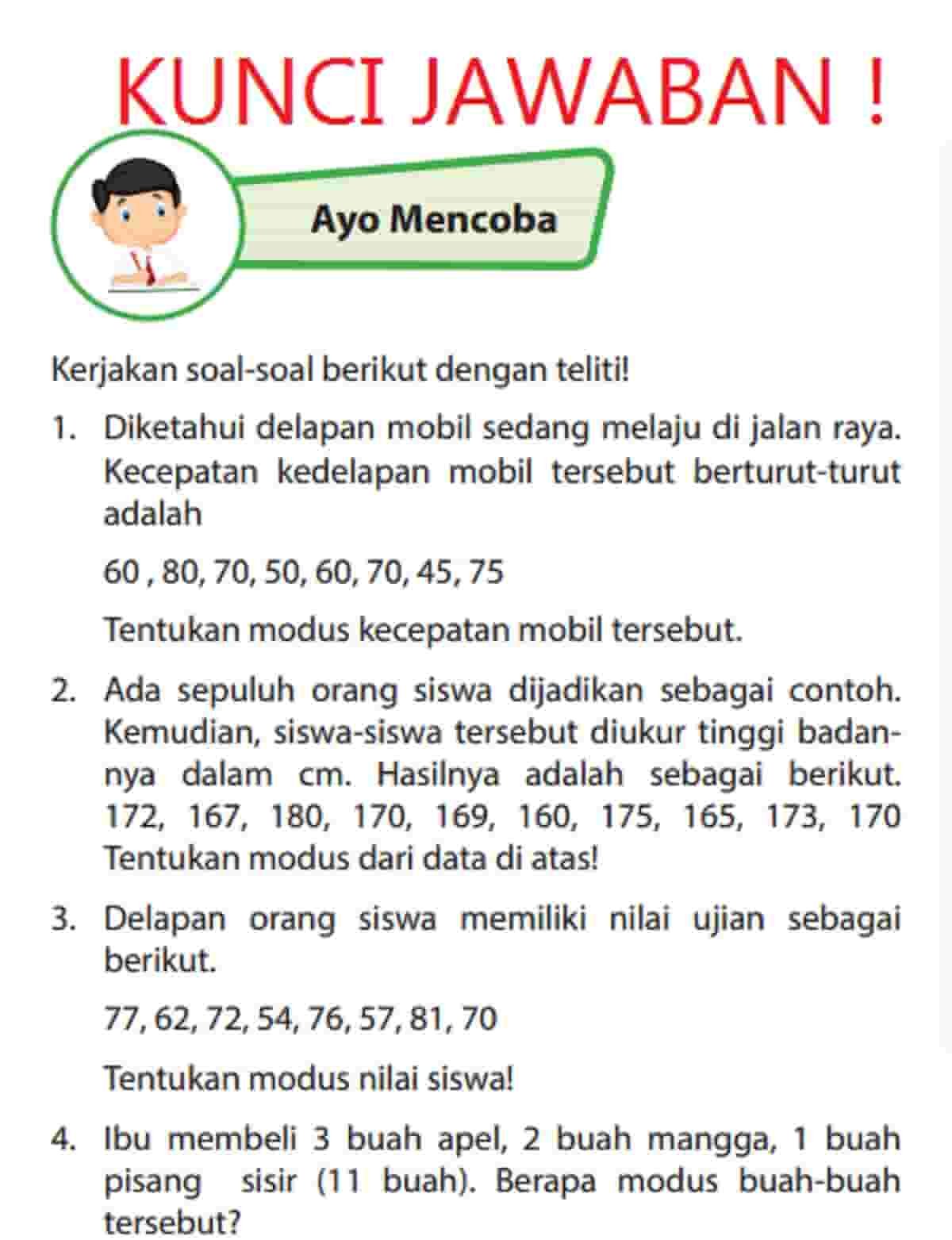 2. Ada sepuluh orang siswa dijadikan sebagai contoh. Kemudian, siswa-siswa tersebut diukur tinggi badannya dalam cm. Hasilnya adalah sebagai berikut. 172, 167, 180, 170, 169, 160, 175, 165, 173, 170 Tentukan modus dari data di atas!