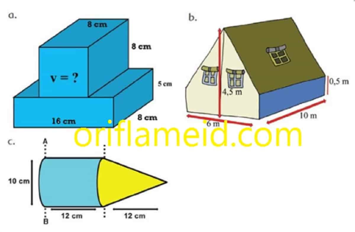 b. Volume gabungan dapat ditentukan dengan penjumlahan volume balok ditambah volume prisma segitiga