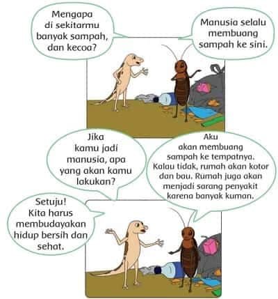 Apa isi percakapan cicak dan kecoa? Mengapa di sekitar kecoak banyak sampah? Pembahasan kunci jawaban tema 4 kelas 2 halaman 22 di buku tematik siswa SD MI kurikulum 2013 revisi 2017. Tepatnya pada materi pembelajaran 3 subtema 1 Hidup Bersih dan Sehat di Rumah.