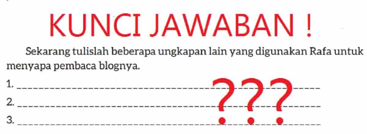 Kunci jawaban Bahasa Indonesia kelas 7 halaman 6 kurikulum merdeka Sekarang tulislah beberapa ungkapan lain yang digunakan Rafa untuk menyapa pembaca blognya, tepatnya pada materi Bab 1 Jelajah Nusantara pada buku semester 1.