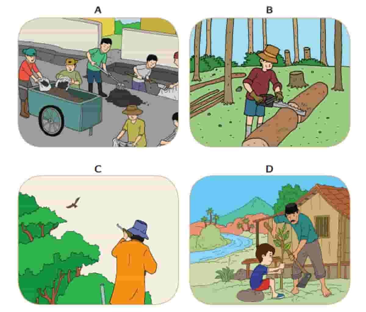 – Gambar B memperlihatkan seseorang yang sedang menebang pohon secara sembarangan. Saya tidak setuju karena kegiatan tersebut berdampak negatif bagi lingkungan. Lingkungan akan rusak akibat penebangan liar.