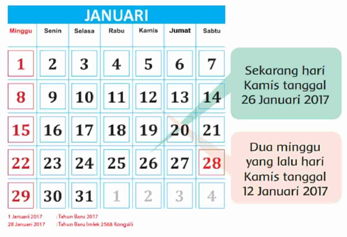 Meli mendapat hadiah dari ayah 2 minggu yang lalu. Sekarang hari Rabu tanggal 18 Januari 2017. Hari dan tanggal berapakah Meli mendapat hadiah dari ayah? Pembahasan kunci jawaban tema 8 kelas 2 halaman 139, tepatnya pada materi pembelajaran 4 subtema 3 Aturan Keselamatan di Perjalanan, buku tematik siswa kurikulum 2013.