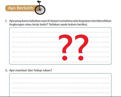 Apa yang kamu lakukan saat di depan rumahmu ada kegiatan membersihkan lingkungan atau kerja bakti, pembahasan kunci jawaban tema 9 kelas 5 halaman 113 114 115 116 tepatnya pada materi pembelajaran 6 subtema 2 Benda dalam Kegiatan Ekonomi di buku tematik siswa sekolah dasar.