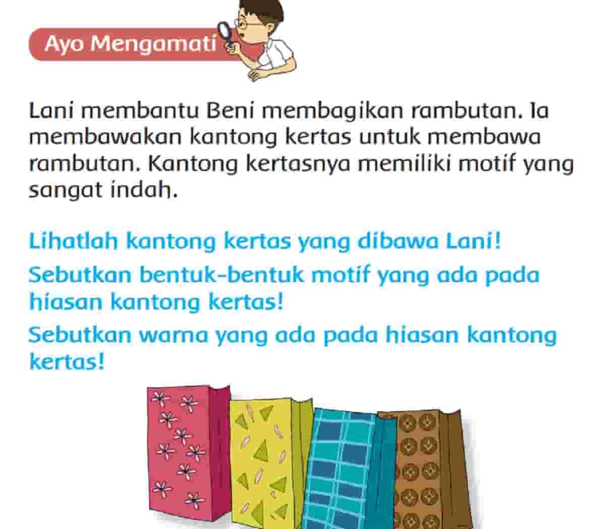 Lihatlah kantong kertas yang dibawa Lani! Sebutkan bentuk-bentuk motif yang ada pada hiasan kantong kertas! Sebutkan warna yang ada pada hiasan kantong kertas!