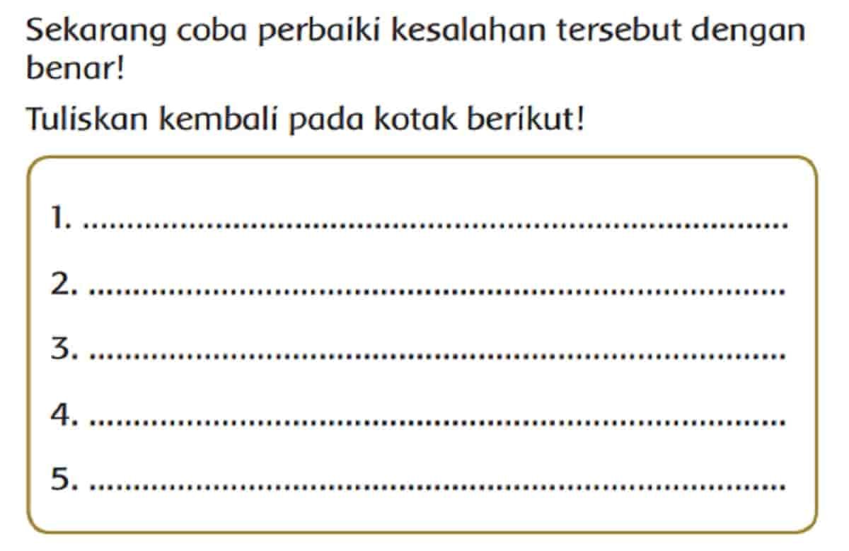 Sekarang coba perbaiki kesalahan tersebut dengan benar! Tuliskan kembali pada kotak berikut! Kamu sudah menemukan kesalahan pada kalimat-kalimat sebelumnya, bukan? Pembahasan kunci jawaban tema 8 kelas 2 halaman 119, tepatnya pada materi pembelajaran 2 subtema 3 Aturan Keselamatan di Perjalanan, buku tematik siswa kurikulum 2013.