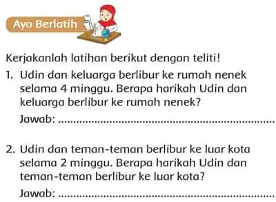 Udin dan keluarga berlibur ke rumah nenek selama 4 minggu. Berapa harikah Udin dan keluarga berlibur ke rumah nenek? Pembahasan kunci jawaban tema 8 kelas 2 halaman 109, tepatnya pada materi pembelajaran 1 subtema 3 Aturan Keselamatan di Perjalanan, buku tematik siswa kurikulum 2013.