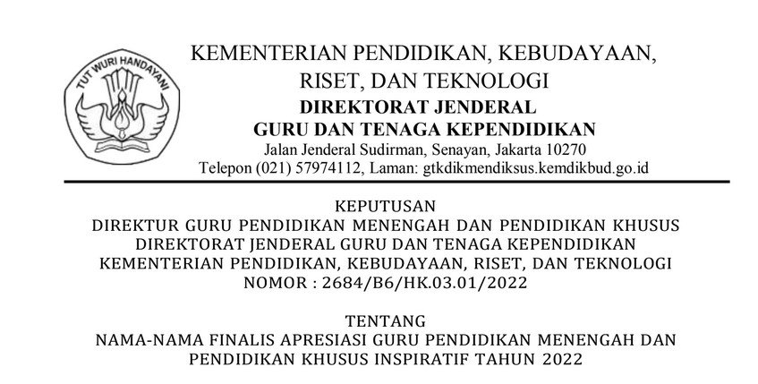 Keputusan Direktur Guru Pendidikan Menengah dan Pendidikan Khusus tentang Nama-nama Finalis Apresiasi Guru Pendidikan Menengah dan Pendidikan Khusus Inspiratif Tahun 2022 diterbitkan dalam rangka pemilihan pendidik dan tenaga kependidikan inspiratif dalam menerapkan pembelajaran berdiferensiasi dalam kontek Merdeka Belajar.