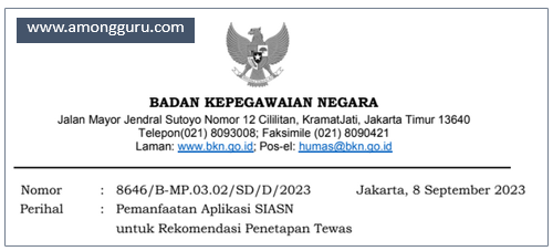 Amongguru.com. Badan Kepegawaian Negara (BKN) telah menerbitkan Surat Edaran BKN Nomor 8646/B-MP.03.02/SD/D/2023 tentang Pemanfaatan Aplikasi SIASN untuk Rekomendasi Penetapan Tewas.