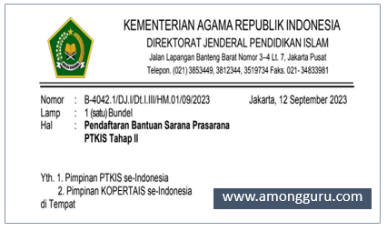 Amongguru.com. Direktorat Jenderal Pendidikan Islam, Kementerian Agama RI telah menerbitkan Surat Edaran Nomor B-4042.1/DJ.I/Dt.I.III/HM.01/09/2023 tertanggal 12 September 2023 tentang Pendaftaran Bantuan Sarana Prasarana PTKIS Tahap II