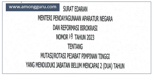Amongguru.com. Menteri PANRB telah menerbitkan Surat Edaran Menteri PANRB Nomor 19 Tahun 2023 tentang Mutasi/Rotasi Pejabat Pimpinan Tinggi yang Menduduki Jabatan Belum Mencapai 2 (Dua) Tahun.