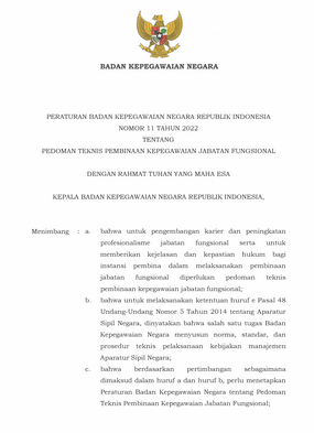 Demikian Peraturan BKN Nomor 11 Tahun 2022 tentang Pedoman Teknis Pembinaan Kepegawaian Jabatan Fungsional. Semoga bermanfaat.