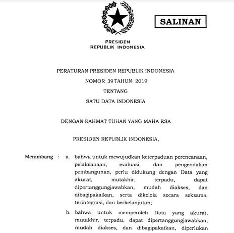 Amongguru.com. Peraturan Presiden (Perpres) Nomor 39 Tahun 2019 diterbitkan secara khusus untuk mengatur tentang Satu Data Indonesia.