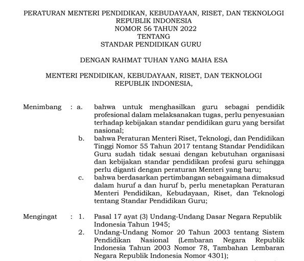 Permendikbudristek Nomor 56 Tahun 2022 tentang Standar Pendidikan Guru diterbitkan dengan mempertimbangkan :
