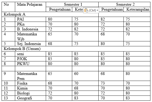 Tabel di atas nerupakan nilai Doni. Nilai sikap Doni B. Jika kriteria ketuntasan belajar minimal 70. Kesimpulan yang diperoleh adalah ….