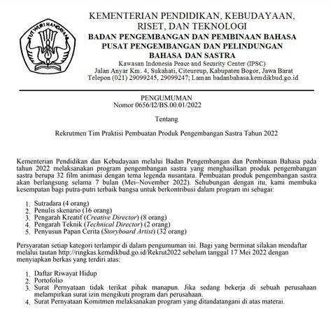 Demikian Pengumuman Rekrutmen Tim Praktisi Pembuatan Produk Pengembangan Sastra Tahun 2022. Semoga bermanfaat.