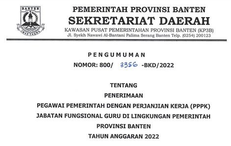 Pengumuman Penerimaan PPPK Jabatan Fungsional Guru di Lingkungan Pemerintah Provinsi Banten Tahun Anggaran 2022 selengkapnya dapat dibaca dan di unduh pada tautan berikut ini.