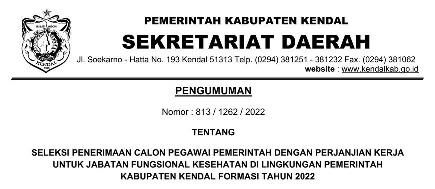 Berdasarkan Keputusan Menteri Pendayagunaan Aparatur Negara dan Reformasi Birokrasi Nomor 617 Tahun 2022 Tanggal 9 September 2022 tentang Penetapan Kebutuhan Pegawai Aparatur Sipil Negara di Lingkungan Pemerintah Kabupaten Kendal Tahun Anggaran 2022, dan Keputusan Bupati Kendal Nomor 893/346/2022 Tanggal 30 September 2022 tentang Penetapan Kebutuhan Pegawai Aparatur Sipil Negara di Lingkungan Pemerintah Kabupaten Kendal Tahun Anggaran 2022, diberitahukan bahwa Pemerintah Kabupaten Kendal memberikan kesempatan kepada putra/putri terbaik bangsa yang berintegritas dan memenuhi syarat menjadi Calon Aparatur Sipil Negara (CASN) di Pemerintah Kabupaten Kendal guna mewujudkan “Kendal Handal, Unggul, Makmur dan Berkeadilan”, dengan mengikuti seleksi penerimaan Calon Pegawai Pemerintah Dengan Perjanjian Kerja (PPPK) untuk Jabatan Fungsional Kesehatan.