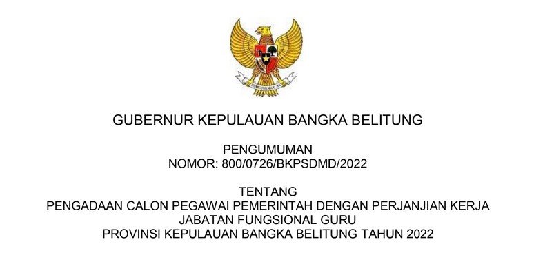 Memperhatikan Keputusan Menteri Pendayagunaan Aparatur Negara dan Reformasi Birokrasi Republik Indonesia Nomor 731 Tahun 2022 tentang Penetapan Kebutuhan Pegawai Aparatur Sipil Negara di Lingkungan Pemerintah Provinsi Kepulauan Bangka Belitung Tahun Anggaran 2022, bahwa Pemerintah Provinsi Kepulauan Bangka Belitung memberikan kesempatan kepada putra/putri warga Negara Republik Indonesia untuk mengikuti seleksi pengadaan Calon Pegawai Pemerintah Dengan Perjanjian Kerja Guru Tahun 2022,