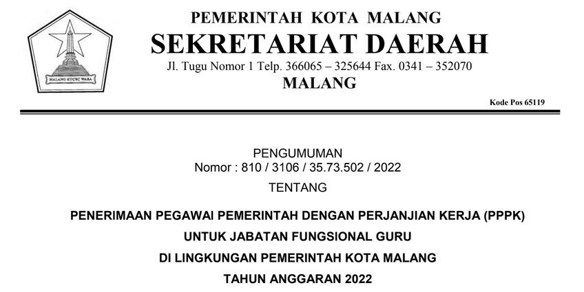 Berdasarkan Keputusan Menteri Pendayagunaan Aparatur Negara dan Reformasi Birokrasi Indonesia Nomor 714 Tahun 2022 tentang Penetapan Kebutuhan Pegawai Aparatur Sipil Negara di Lingkungan Pemerintah Kota Malang Tahun Anggaran 2022, dibuka kesempatan bagi Putra/Putri Warga Negara Republik Indonesia yang berminat menjadi Pegawai Pemerintah Dengan Perjanjian Kerja (PPPK) untuk Jabatan Fungsional Guru.