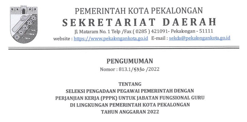 Berdasarkan Keputuasan MenPANRB Nomor 506 Tahun 2022 tentang Penetapan Kebutuhan Pegawai ASN di Lingkungan Pemerintah Kota Pekalongan Tahun Anggaran 2022, maka Pemerintah Kota Pekalongan akan menerima Calon ASN untuk Jabatan Fungsional Guru dengan formasi sebanyak 117 (seratus tujuh belas). Formasi secara lengkap sebagaimana yang tersebut dalam lampiran Pengumuman ini.