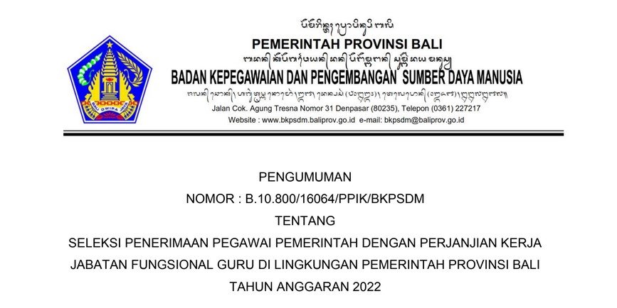 Berdasarkan Keputusan Menteri Pendayagunaan Aparatur Negara dan Reformasi Birokrasi Nomor 540 Tahun 2022 tentang Penetapan Kebutuhan Pegawai Aparatur Sipil Negara di Lingkungan Pemerintah Provinsi Bali Tahun Anggaran 2022 dan Surat Plt. Kepala BKN Nomor 36095/B-KS.04.01/SD/K/2022 hal Jadwal Pelaksanaan Seleksi Penerimaan PPPK Guru Tahun 2022, dengan ini diumumkan kembali sebagaimana yang telah disampaikan dalam siaran Pers Nomor : 022/RILIS/BKN/X/2022 tanggal 31 Oktober 2022 bahwa Pemerintah Provinsi Bali membuka pendaftaran untuk menjadi Pegawai Pemerintah Dengan Perjanjian Kerja (PPPK) untuk Jabatan Fungsional (JF) Guru
