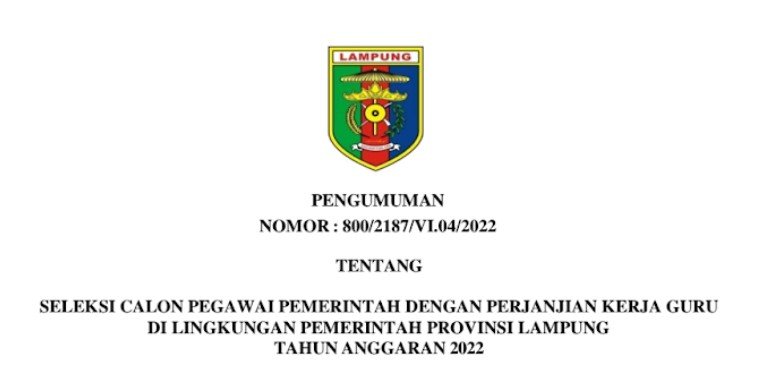 Di dalam rangka pengisian kebutuhan pegawai Aparatur Sipil Negara (ASN) di Lingkungan Pemerintah Provinsi Lampung Tahun Anggaran 2022, sebagaimana telah ditetapkan dalam Keputusan Gubernur Lampung Nomor : G/501/VI.04/HK/2022 Tanggal 04 Oktober 2022 tentang Penetapan Kebutuhan Pegawai Aparatur Sipil Negara di Lingkungan Pemerintah Provinsi Lampung Tahun Anggaran 2022, bersama ini Pemerintah Provinsi Lampung memberikan kesempatan kepada masyarakat yang memenuhi persyaratan untuk mengikuti Seleksi Calon Pegawai Pemerintah dengan Perjanjian Kerja (PPPK) Guru di Lingkungan Pemerintah Provinsi Lampung Tahun Anggaran 2022.
