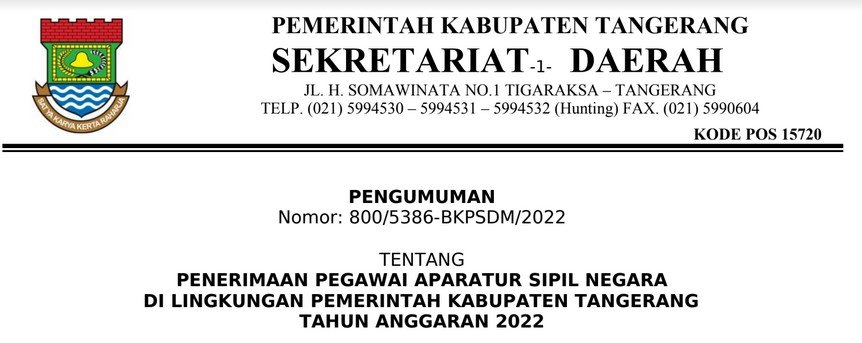 Berdasarkan Keputusan Menteri Pendayagunaan Aparatur Negara dan Reformasi Birokrasi Republik Indonesia Nomor 410 Tahun 2022 tentang Penetapan Kebutuhan Pegawai Aparatur Sipil Negara di Lingkungan Pemerintah Kabupaten Tangerang Tahun Anggaran 2022 dan Keputusan Bupati Tangerang Nomor 800/Kep.755-Huk/2022 Tahun 2022 tentang Penetapan Kebutuhan Pegawai Aparatur Sipil Negara di Lingkungan Pemerintah Kabupaten Tangerang Tahun Anggaran 2022, dibuka kesempatan bagi Putra/Putri terbaik Warga Negara Republik Indonesia yang berminat menjadi Pegawai Aparatur Sipil Negara (ASN)