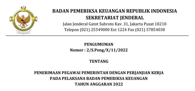 Berdasarkan Keputusan Menteri Pendayagunaan Aparatur Negara dan Reformasi Birokrasi Republik Indonesia Nomor 416 Tahun 2022 Tanggal 6 September Tahun 2022 tentang Penetapan Kebutuhan Pegawai Aparatur Sipil Negara di Lingkungan Badan Pemeriksa Keuangan Tahun Anggaran 2022, BPK membuka kesempatan kepada Warga Negara Indonesia, Pria dan Wanita, berpendidikan Sarjana (S-1) dan Diploma III (D-III) untuk mengikuti seleksi Pegawai Pemerintah dengan Perjanjian Kerja (PPPK) untuk ditempatkan pada Kantor BPK di seluruh Indonesia.
