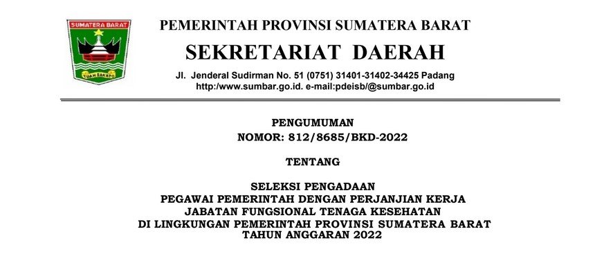 Berdasarkan Keputusan Menteri Pendayagunaan Aparatur Negara dan Reformasi Birokrasi Republik Indonesia Nomor 803 Tahun 2022 tentang Penetapan Kebutuhan Pegawai Aparatur Sipil Negara di Lingkungan Pemerintah Provinsi Sumatera Barat Tahun Anggaran 2022, Pemerintah Provinsi Sumatera Barat akan melaksanakan Seleksi Pengadaan Pegawai Pemerintah dengan Perjanjian Kerja (PPPK) Jabatan Fungsional Tenaga Kesehatan Tahun Anggaran 2022 dengan kriteria: