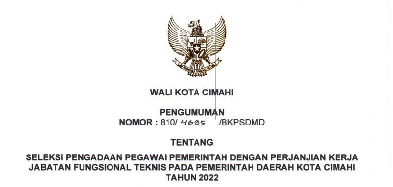 Berdasarkan Keputusan MenPANRB Nomor 463 Tahun 2022 tentang Penetapan Kebutuhan Pegawain ASN di Lingkungan Pemerintah Kota Cimahi Tahun Anggaran 2022, maka Pemerintah Daerah Kota Cimahi akan melaksanakan Seleksi Pengadaan PPPK pada Pemerintah Kota Cimahi Tahun 2022.