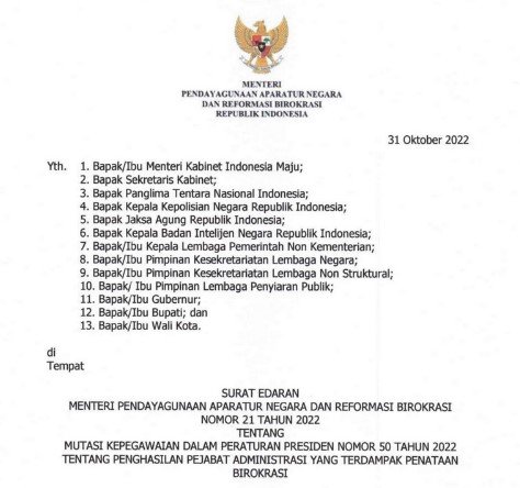 Demikian SE MEnPANRB Nomor 21 Tahun 2022 tentang Mutasi Kepegawaian Dalam Perpres Nomor 50 Tahun 2022 tentang Penghasilan Pejabat Administrasi Yang Terdampak Penataan Birokrasi. Semoga bermanfaat.