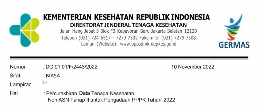 Surat Edaran Pemutakhiran Data Tenaga Kesehatan Non ASN Tahap II untuk Pengadaan PPPK Tahun 2022 tersebut bernomor DG.01.01/F/2443/2022 tertanggal 10 November 2022.