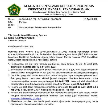 Edaran Kemenag tentang Penundaan Pre Test PPG PAI Tahun 2022