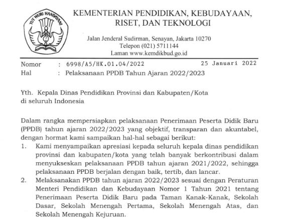 Kementerian Pendidikan, Kebudayaan, Riset, dan Teknologi menerbitkan Surat Edaran tentang Pelaksanaan Penerimaan Peserta Didik Baru Tahun Ajaran 2022/2023 ini sesuai surat edaran bernomor 6998/A5/HK.01.04/2022 tertanggal 25 Januari 2022.